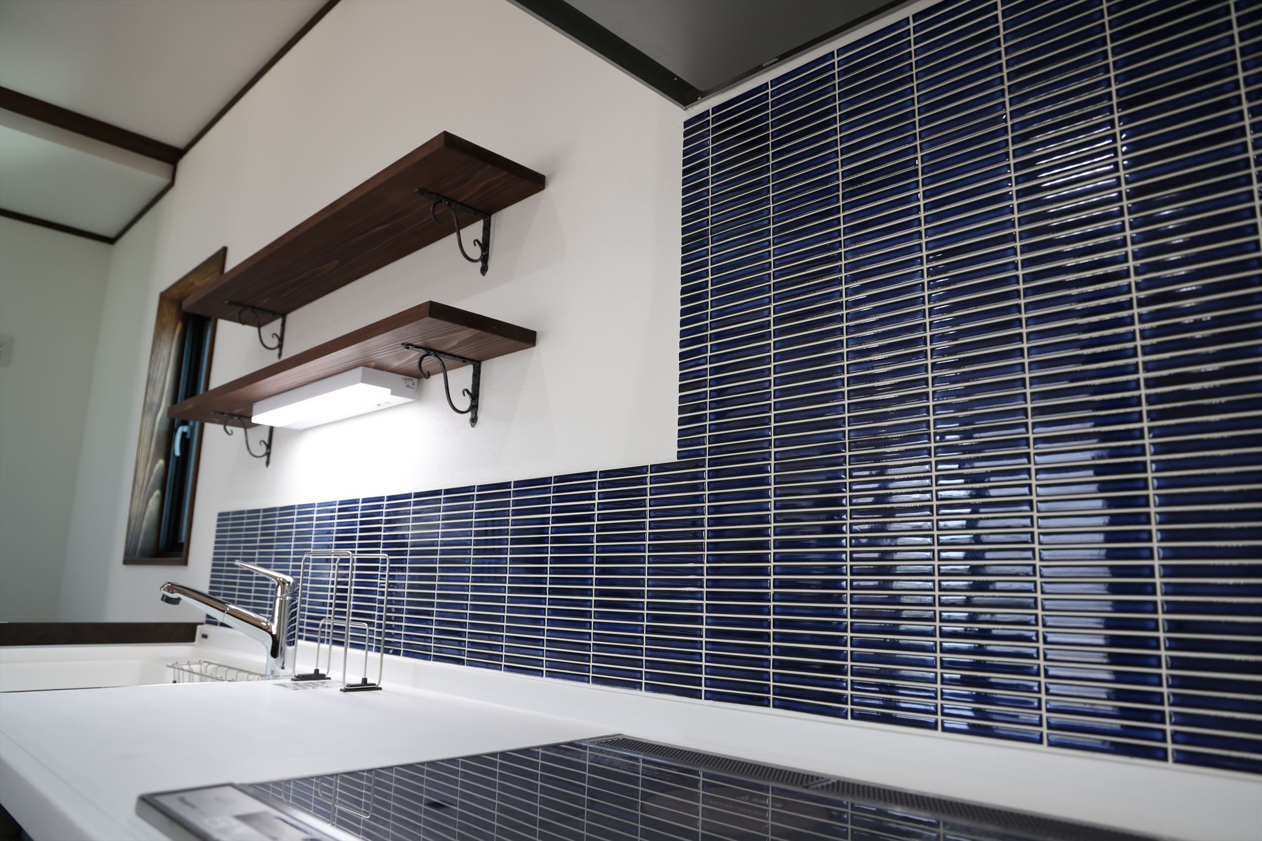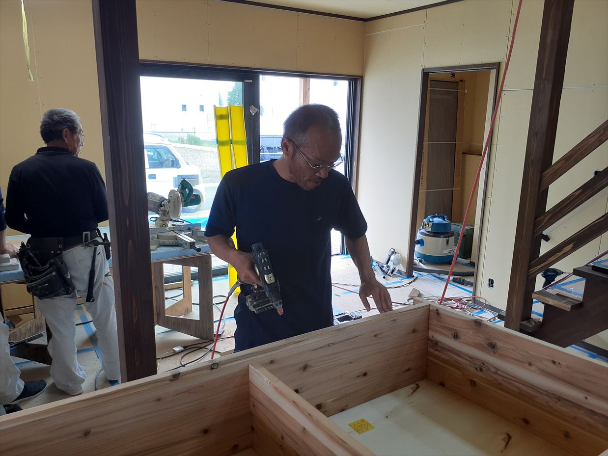 こんにちは。 先ほどご紹介させていただきました「板野の家」ではDIYもお手伝いさせていただきました。 昨年の春、初めてお施主様とお打合せさせていただきました。お話の中で、 「自分たちも家づくり(工事)に少し関われれば」 という御希望がありました。 そこで、生活の中で自然に目に入って「いいなあ」と思える部分に取り入れたいなあと 思い、お家の計画中も頭の隅に置き計画をすすめました。 そこで次の2項目を計画しました。 ・比較的施工が容易なシートタイル貼りをアクセントとして採用 ・可動式のキッチンカウンター造り タイルは今回の懐かしい雰囲気のお家にはアクセントとしてピッタリ、可動式のカウンターは 壁付けキッチンの場合は、家具配置に自由度があります。 材料等の手配や家具の図面作成・加工はお手伝いさせていただきました。 その時の様子がこちら